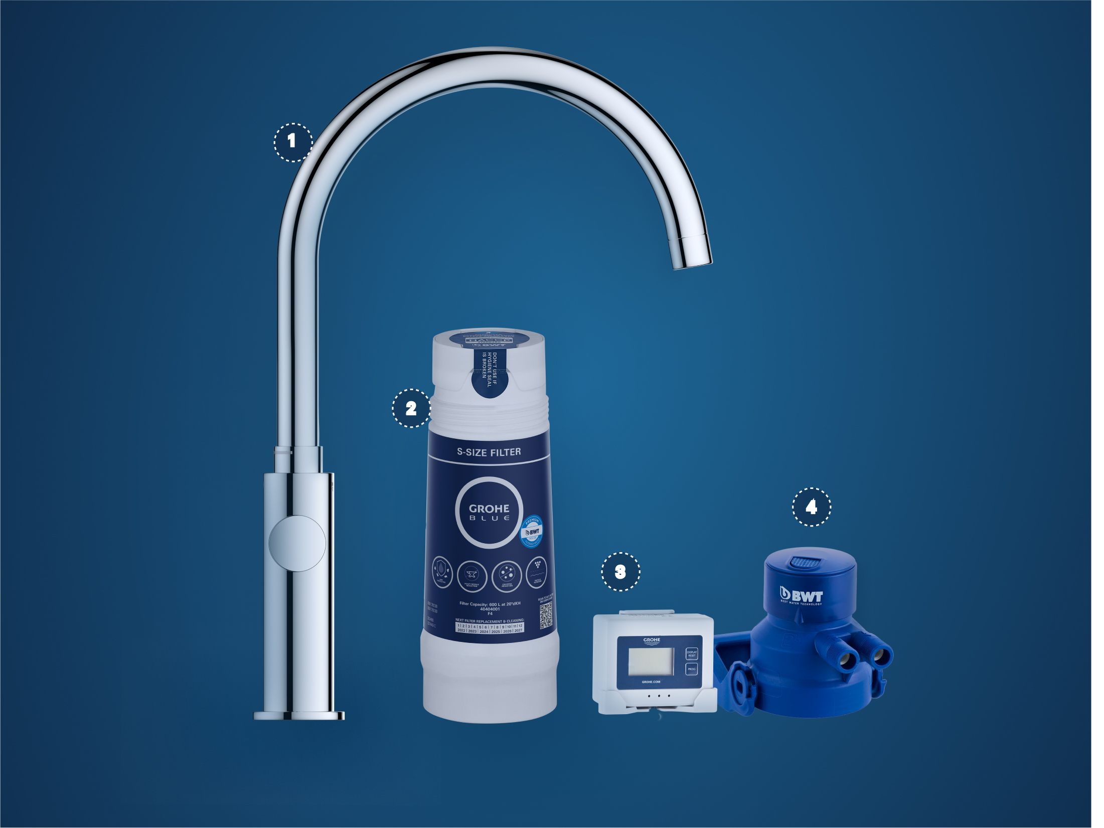 Il kit del sistema di filtrazione dell'acqua GROHE Blue Pure include un rubinetto 2in1 filtrante, un filtro, una testa del filtro e un contalitri o un timer di sostituzione del filtro. -