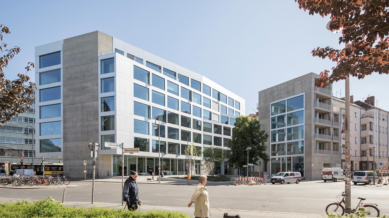 Anche la trasparenza e l’apertura hanno avuto un ruolo decisivo nella progettazione dei due edifici restanti da parte dello studio Bundschuh Architekten. Al piano terra dell’edificio residenziale su Linienstrasse, il proprietario della galleria Daniel McLaughlin ha aperto la sua filiale; pochi metri più avanti, al piano terra dell’edificio di collegamento, il produttore olandese di biciclette VanMoof ha trasferito la sua sede berlinese. Le ampie vetrate frontali offrono ai passanti una vista completa.